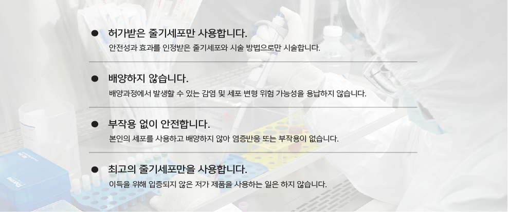 ๋ํด๋ฆฌ๋ ์ค๊ธฐ์ธํฌ๋ ์์ ์ฑ๊ณผ ์ ํจ์ฑ ํ๋ณด ์ ์ง ๊ธฐ์ ๋ก ์ฒ์๋ถํฐ ๋ค๋ฆ ๋๋ค. ํ๊ฐ ๋ฐ์ ์ค๊ธฐ ์ธํฌ๋ง ์ฌ์ฉํ๋ฉฐ ๋ฐฐ์ํ์ง ์๊ณ ์ฌ์ฉํฉ๋๋ค. ๋ฐฐ์ ๊ณผ์ ์์ ๋ฐ์ํ ์ ์๋ ๊ฐ์ผ ๋ฐ ์ธํฌ ๋ณํ ์ํ ๊ฐ๋ฅ์ฑ์ ์ต์ํ ํด ์ผ์ฆ๊ณผ ๋ถ์์ฉ์ด ์์ต๋๋ค.
